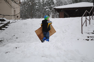 後來,樓上鄰居帶著朋友和小朋友們要去"滑雪",問我們要不要一起去,就在後面的遊樂區的ㄧ個陡坡,我們就一起去玩囉!這不是真正的滑雪,是像滑草一樣的滑雪,凱凱玩的可瘋了,還有3個大哥哥一起。最大的男孩很照顧凱凱,會跟他一起滑,也會扶他上去。這個滑雪很簡單,我們只帶著紙箱,把它攤平後,做上去就可以玩啦!超刺激的!