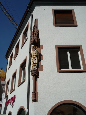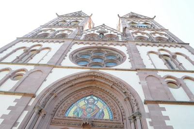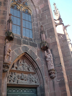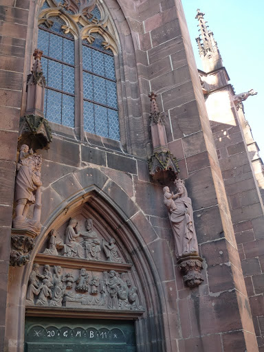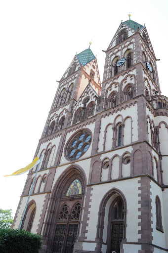 Freiburg Münster 是屬於歌德式天主教教堂,因此有基本的類十字架型結構,於基部擁有一座高116M的高塔。其建於1120年,是由Freiburg當地富商或市民集資建造的,中間常由於經費不足,而分成三期,最後於1330才完成;也因此Freiburg大教堂由正門到末端,漸層地出現不同時期的教堂建築形式,它的雕刻、彩繪玻璃以及入口大門上方的雕畫,不但完全發揮後期歌德式華麗複雜的特色,甚至還隱約看到點更後期超奢華的巴洛克風格,但在教堂主體上還同時出現了羅馬式後期至歌德式前期左右特有的拱臂結構,可以說在一個教堂上完一大段的建築課。此外,它與其他德國各處教堂最不同的幾個特色是,它有一個縷空的塔頂,站在最高層中心往上看,可以看到超藍的天空所襯托的古典石雕鐘塔;我非常的喜歡它的塔頂,不過由於,大教堂就在整修,搭著鷹架,拍不到整個縷空的照片。更糟的是,我們去的那天剛好是品酒節,所以整個教堂的四週都是攤販和其搭建的大帳篷,連想拍一張好看得照片都不怎麼拍的到。